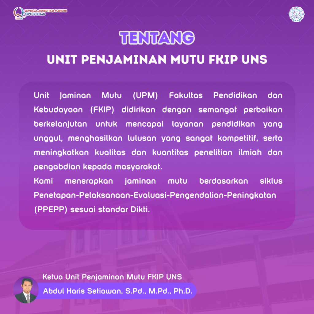 Unit Penjaminan Mutu Fakultas Keguruan dan Ilmu Pendidikan (FKIP) didirikan dengan semangat perbaikan berkelanjutan untuk mencapai layanan pendidikan yang unggul, menghasilkan lulusan yang sangat kompetitif, serta meningkatkan kualitas dan kuantitas penelitian ilmiah dan pelayanan masyarakat. Kami menerapkan jaminan mutu berdasarkan siklus Penetapan-Pelaksanaan-Evaluasi-Pengendalian-Peningkatan (PPEPP) sesuai standar Dikti. Slogan kami adalah ‘Visioner,’ yang mencerminkan visi bersama kami untuk masa depan Fakultas.